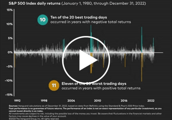 Not only will focusing on daily returns likely drive you crazy, but it’s nearly impossible to draw an inference as to how coming months, quarters, or years may play out when it comes to overall positive or negative market performance. In fact, looking at the S&P 500 Index daily returns from 1980-2022, eleven of the 20 worst trading days occurred in years with positive total returns, and ten of the 20 best trading days occurred in years with negative total returns.Check out this playable graphic from Vanguard displaying how noisy daily returns can be: